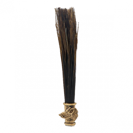 Hyb do kapelusza z motywem dzika wyróżnia się nie tylko materiałem, ale także wyjątkowym zdobieniem. Ręcznie odlany z brązu element ozdobny nawiązuje do natury, dzięki motywowi dzika, co nadaje całości unikalnego, rustykalnego charakteru. To idealny dodatek dla osób ceniących sobie tradycję oraz wysoką jakość wykonania. Brązowy uchwyt zapewnia solidność, jednocześnie doskonale współgrając z naturalnym włosiem dzika.