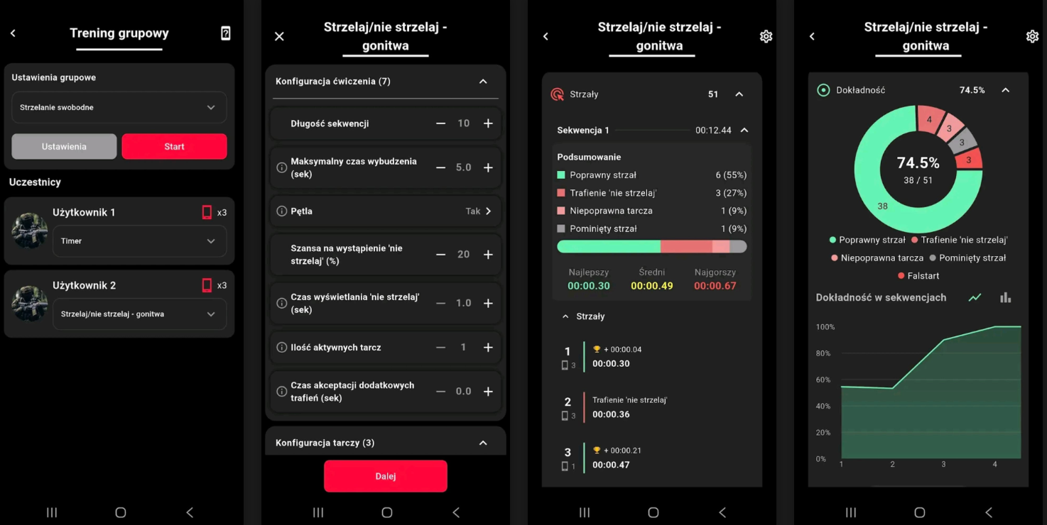 Pomiar czasu od sygnału „start” do pierwszego trafienia (przydatny przy doskonaleniu umiejętności obycia z bronią, przeładowania broni, zajęcia pozycji strzeleckiej).