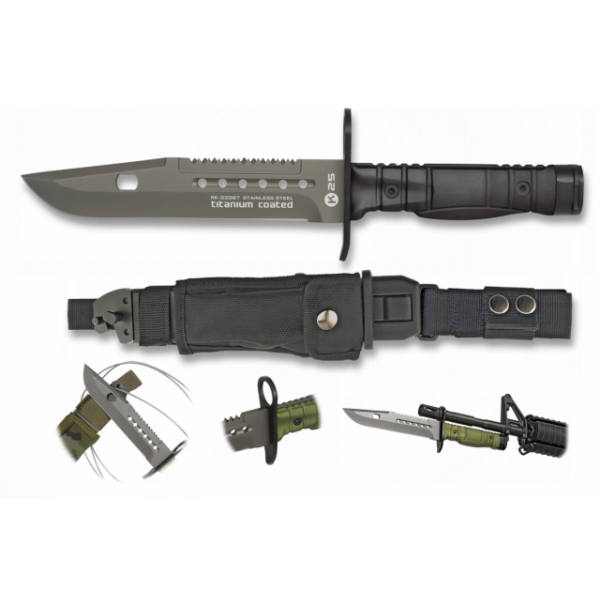 Nóż bagnet K25 32067 to solidne, taktyczne narzędzie z głownią ze stali 7Cr17MoV i trwałą powłoką tytanową. Piła na grzbiecie i przecinak do drutu zwiększają funkcjonalność w terenie, a aluminiowa rękojeść zapewnia pewny chwyt i wytrzymałość.