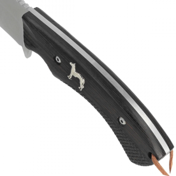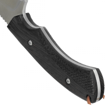 ✦ Rękojeść wykonana z naturalnego drewna Zebrawood wyróżnia się efektownym, pasiastym usłojeniem oraz wysoką odpornością na wilgoć i ścieranie. Ergonomiczne profilowanie oraz podcięcia pod palce zapewniają pewny i stabilny chwyt, również w trudnych warunkach terenowych lub w rękawicach. Okładziny zostały trwale zamocowane do trzpienia przy pomocy stalowych nitów, co zwiększa trwałość całej konstrukcji.
