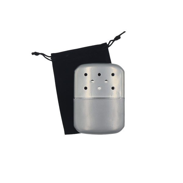 Ogrzewacz idealnie nadaje się na jesienne i zimowe dni. Dzięki niemu można ogrzać dłonie nawet na największym mrozie. W zestawie z zielonym welurowym woreczkiem i dozownikiem do wlewania benzyny.