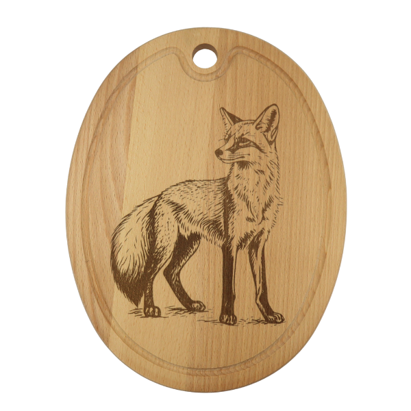 Elegancka Owalna Deska Drewniana do Krojenia i Serwowania 38 cm z grawerem w stylu myśliwskim z motywem Lisa.